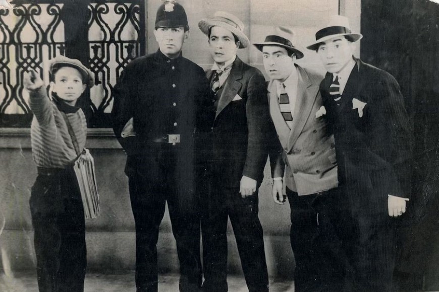 Piazzolla interpretando a un canillita junto a Gardel, Tito Lusiardo y Manuel Peluffo en una escena de la película "El día que me quieras” (1935).
