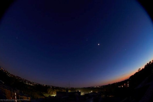 Para lograr captar el momento, Masi eligió dos lentes de ojo de pez con capacidad panorámica extrema para capturar todos los planetas del sistema en un mismo encuadre. En los minutos siguientes a la puesta del Sol, podían percibirse a simple vista la Luna, Marte, Júpiter y Venus, alineación a la que pronto se sumó Saturno.