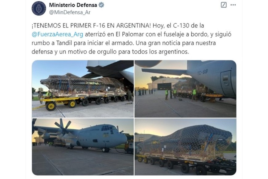 “¡TENEMOS EL PRIMER F-16 EN ARGENTINA! Hoy, el C-130 de la @FuerzaAereaArg aterrizó en El Palomar con el fuselaje a bordo, y siguió rumbo a Tandil para iniciar el armado. Una gran noticia para nuestra defensa y un motivo de orgullo para todos los argentinos”, publicó Petri.