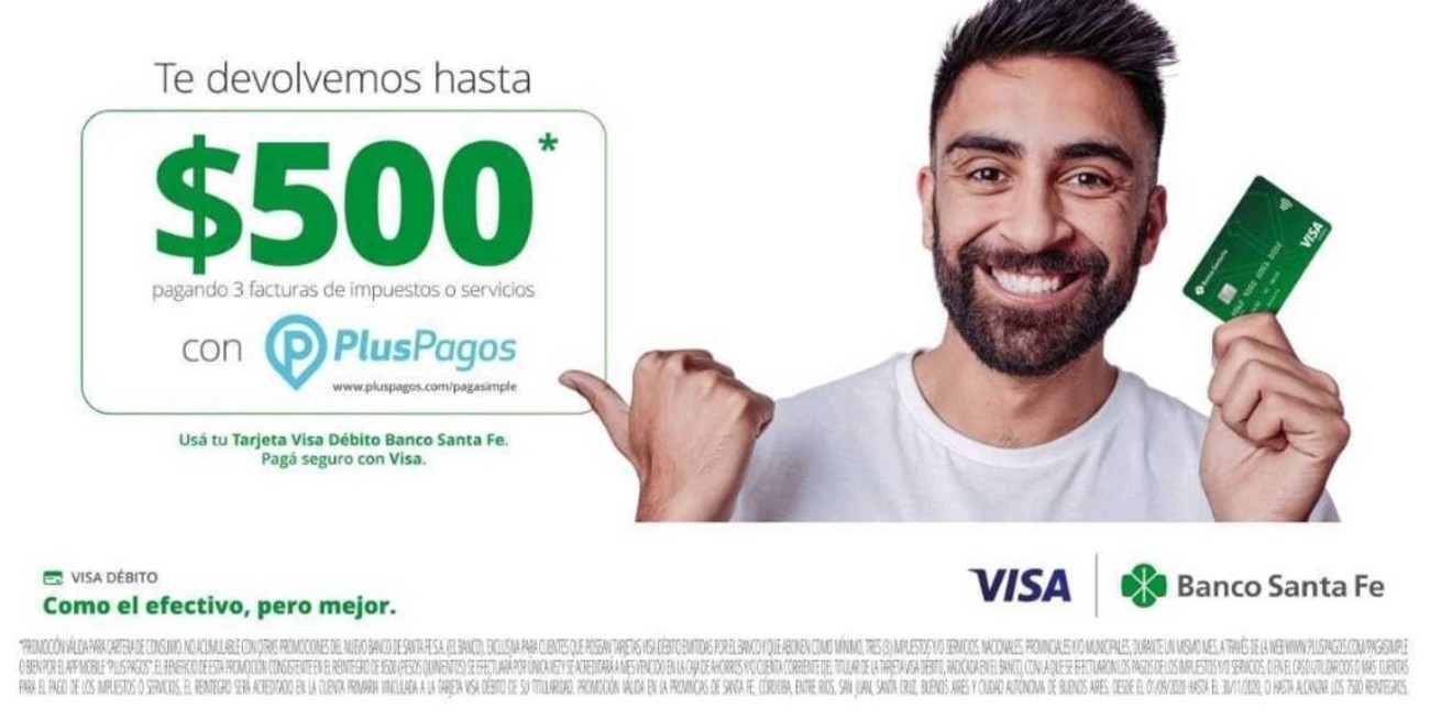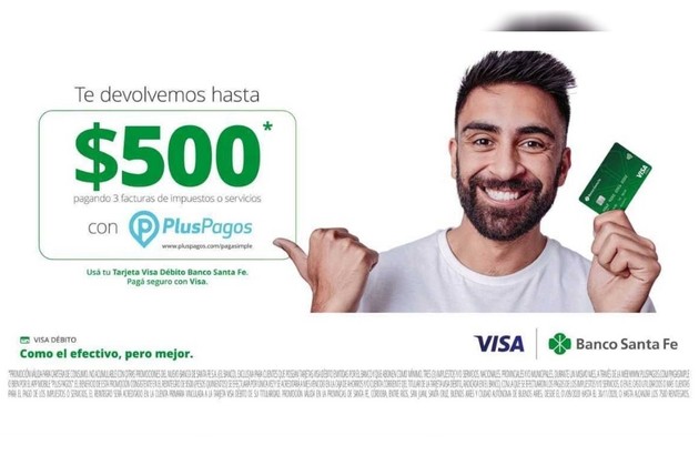Banco Santa Fe y Visa lanzaron una campaña de educación financiera para promover el uso de la tarjeta de débito con un importante incentivo que consiste en la devolución de hasta 500 pesos con el pago de 3 facturas de impuestos o servicios a través de la web o la app de PlusPagos.