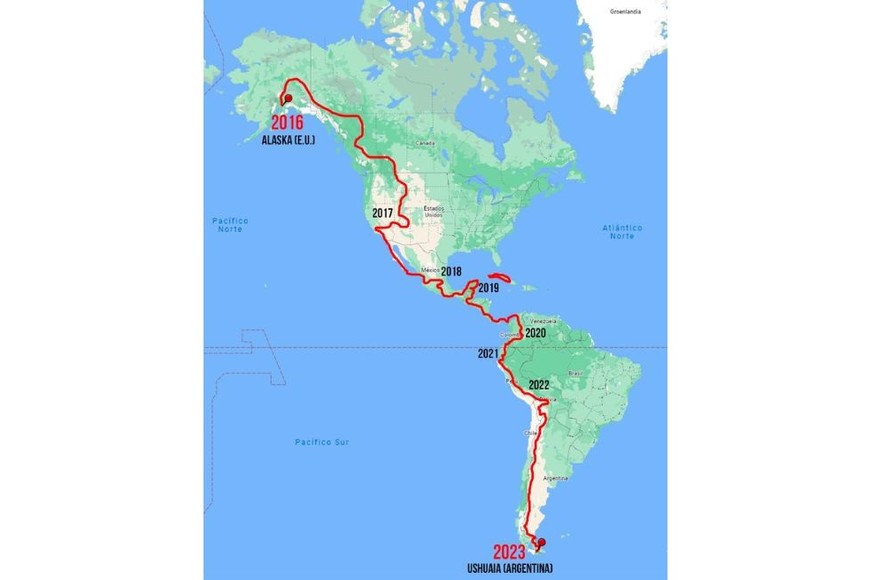 Desde allí, el tapón de Darién (Panamá) y, como no hay ruta entre Panamá y Colombia, atravesaron el mar en velero por el Archipiélago de San Blas, hasta llegar a Cartagena y desde ese punto, tanto Colombia como Ecuador y gran parte de Perú, pasaron por Los Andes hasta llegar a Bolivia (Altiplano). Finalmente ingresaron al país por la frontera de La Quiaca y pedalearon por la famosa Ruta 40 con algunos pequeños desvíos, hasta llegar a Cabo Vírgenes (Km 0) y de allí llegaron a la isla de Tierra del Fuego por ruta 3, para llegar a su destino Ushuaia, donde hoy se encuentran.