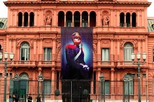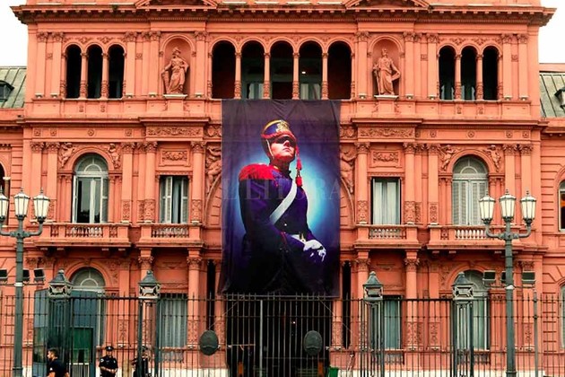 La fachada de la Casa Rosada despliega este viernes arriba de su entrada principal, en Balcarce 50, una gigantografía de un granadero, en homenaje al Día del Granadero, soldado que cumple desde 1903 nada menos que la función de escolta presidencial y transmisor de los valores de su creador, el general José de San Martín.