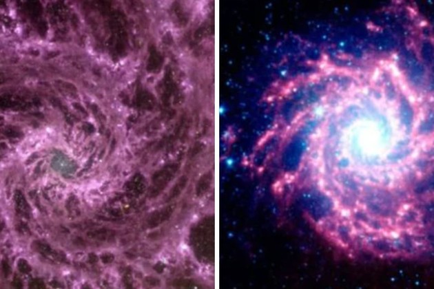 NGC 628 se parece mucho a la Vía Láctea si pudiera ser fotografiada desde arriba. Las anteriores imágenes ya habían revelado esta estructura con anterioridad. Sin embargo, el Webb revela elementos ocultos, como una composición química única de las nubes de polvo, que se forman principalmente de moléculas grandes llamadas hidrocarburos aromáticos policíclicos y que le dan ese tono violeta.