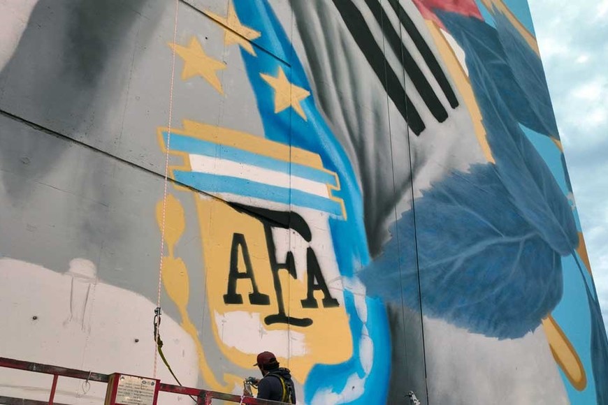 Ya se ven las 3 estrellas en el mural de Messi. Crédito: Fernando Nicola
