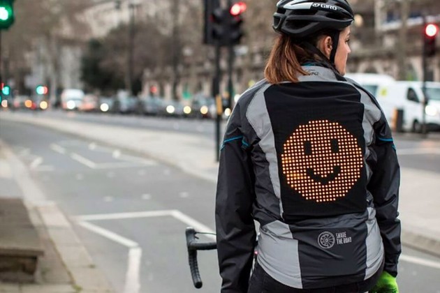 De implementarse esta campera, los ciclistas podrían tener seis símbolos para “comunicarse” con los conductores de vehículos: flechas hacia la izquierda y la derecha para indicar los giros, un signo de alerta para señalar algún problema, y tres caras de emojis para hacerles ver cómo se sienten: contentos, tristes o indiferentes.