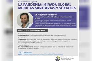 La Defensoría del Pueblo de la provincia de Santa Fe invita a la conferencia magistral “La pandemia: mirada global, medidas sanitarias y sociales”, que brindará este jueves 15 de octubre, a las 13 horas, el doctor Alejandro Roisentul, argentino nominado al Premio Nobel de la Paz por su labor humanitaria en Israel. La exposición se realizará a través de la plataforma Zoom y la inscripción es libre y gratuita.
