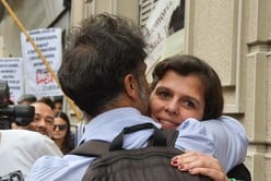 Escrache. Sabrina junto a Taty Almeida, Madre de Plaza de Mayo, durante un escrache a Miguel Torrealday, uno de los médicos responsables de la desaparición de su hermano mellizo, en Paraná.