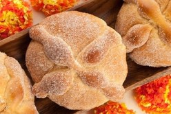 El "Pan de muerto" es un dulce típico mexicano que se come en la semana de las celebraciones por el Día de los Muertos. Consiste en una pequeña esfera en el centro de la parte superior que figura ser un cráneo y cuatro brazos o "canillas", que representan huesos y simbolizan los cuatro rumbos del nahuolli o universo.