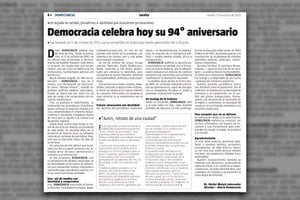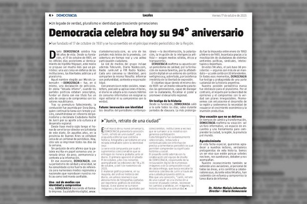 Diario DEMOCRACIA celebra 94 años de vida. Desde su fundación, el 17 de octubre de 1931, en los difíciles días posteriores al derrocamiento de Hipólito Yrigoyen, este medio se propuso ser mucho más que un periódico: una voz cívica en defensa de las instituciones, las libertades públicas y el pluralismo.