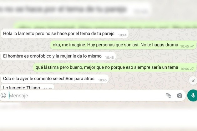 En la citada captura de pantalla se ve que la persona allegada a Leis le señaló: "Lo lamento, pero no se hace por el tema de tu pareja. El hombre es homofóbico y a la mujer le da lo mismo; cuando ella le comentó, se echaron para atrás".