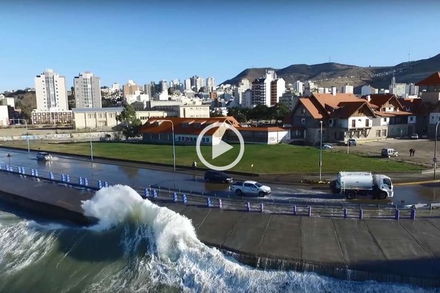 La nave no tripulada se posó sobre la costanera de la ciudad chubutense y mostró el avance de las olas sobre la calle.