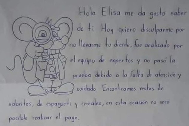 El argumento de los adultos que redactaron la carta es la ‘’falta de atención y cuidado’’ que tiene el diente, por lo que en esta ocasión el personaje de fantasía no dejó el dinero. Indicando que para la próxima vez, deberá cepillarlos y protegerlos más.