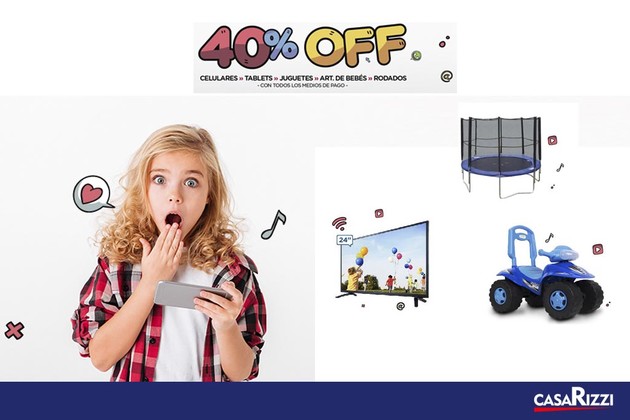 Durante toda la semana y en cualquiera de las sucursales de Rizzi, vas a encontrar la súper promo de hasta 40% de descuento con Crédito Rizzi en Celulares, Tablets, Play Station 4, Juguetes, Art. de Bebes y Rodados.