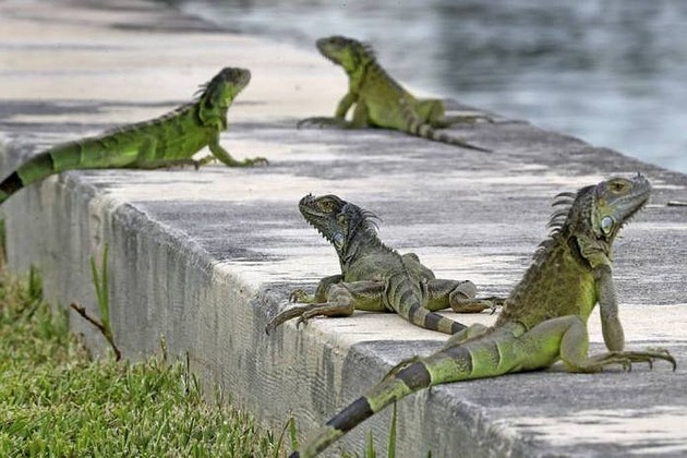 Las iguanas, una especie considerada invasora en el sur de Florida, tienden a caer de los árboles donde duermen y si bien no mueren en el acto, a veces dejan las calles tapizadas con sus cuerpos. Estos reptiles hibernan hasta que suben las temperaturas, para luego volver a su vida normal.