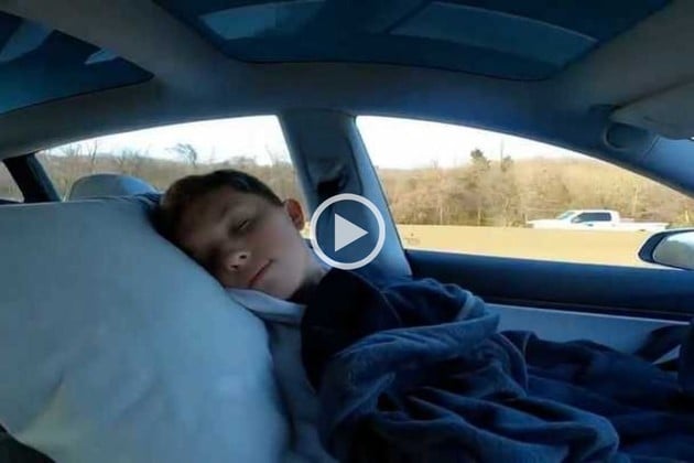 En un primer momento se ve al joven en el puesto de conducción fingiendo estar dormido mientras el Tesla Model 3 avanza por una autopista. Pero luego directamente se pasa al sector trasero, se recuesta y se tapa, simulando estar durmiendo.
