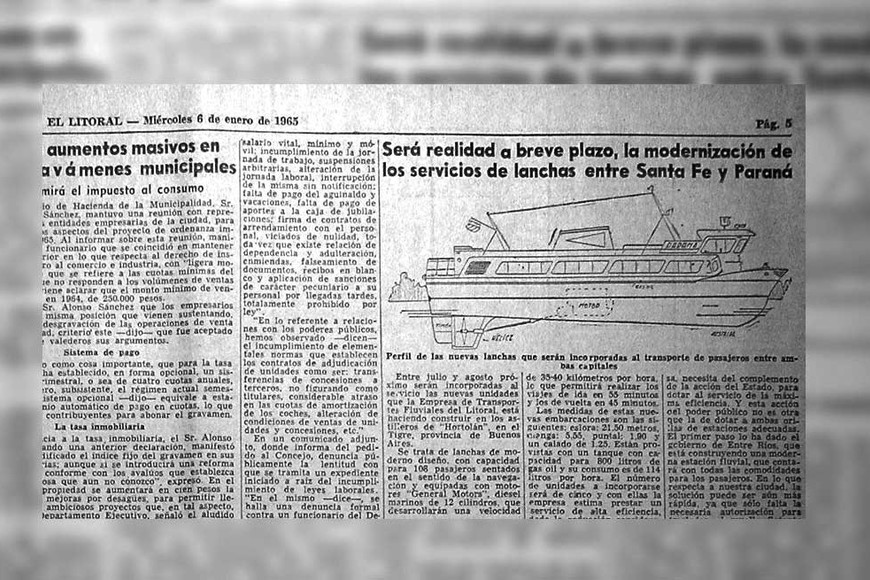 “Será realidad a breve plazo, la modernización de los servicios de lanchas entre Santa Fe y Paraná”, tituló El Litoral en el verano del ‘65. El artículo destacó las principales características de las novedosas embarcaciones y cómo ayudaría a optimizar los tiempos y la calidad de viaje. Con la incorporación de estos ferries, el viaje podría completarse en menos de una hora.