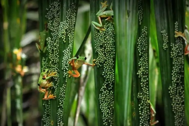 Un raro frenesí de cría de ranas arbóreas en Puntarenas, Costa Rica. Estos espectaculares eventos de cría en masa ocurren sólo en algunos lugares remotos, unas pocas veces al año. Cada hembra pone alrededor de 200 huevos y, finalmente, los renacuajos nacidos caen al agua. Crédito: Brandon Güell
