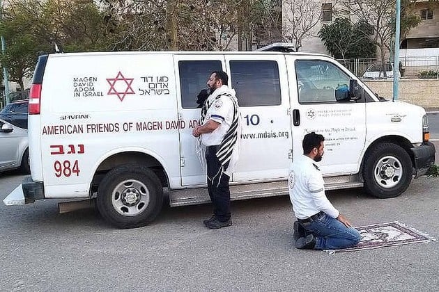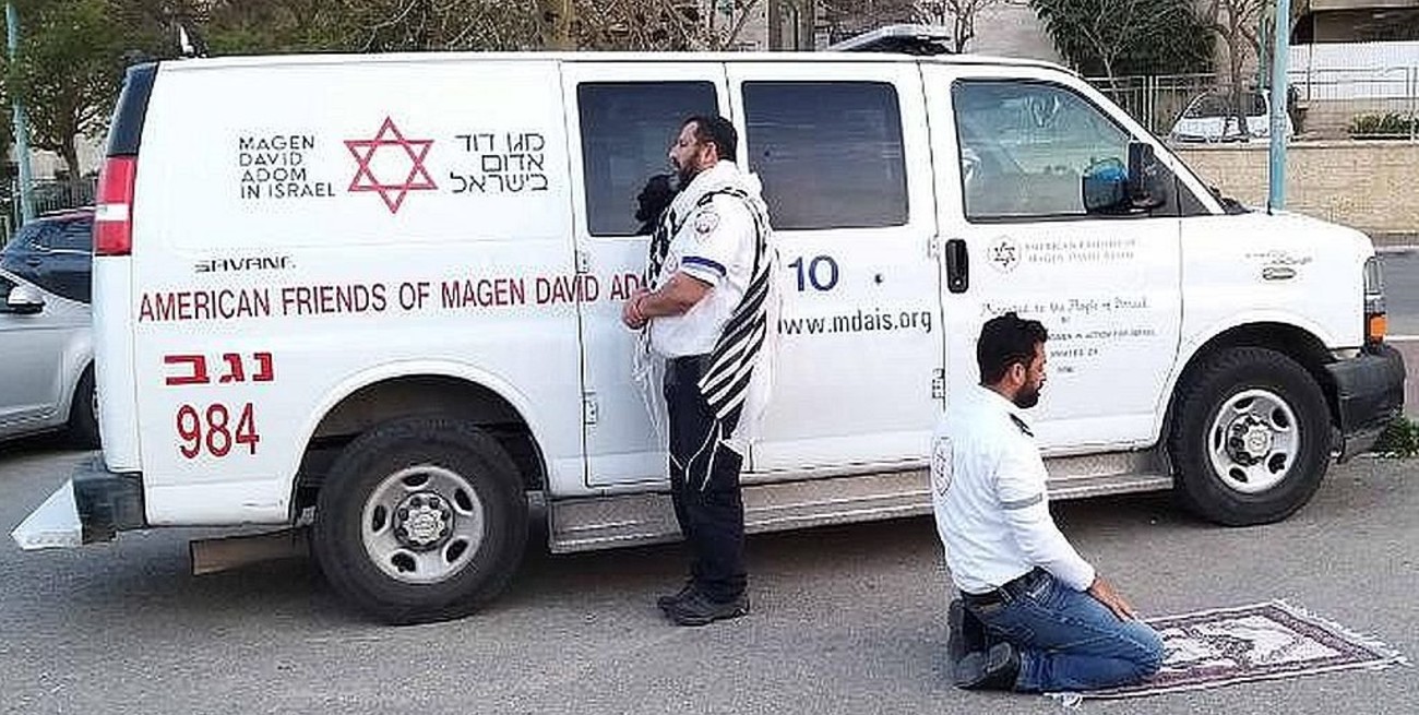 Tenés que leerAnte la plaza de San Pedro vacía, el papa Francisco dará una bendición al mundoCuando el reloj se acercaba a las seis de la tarde, Mintz y Abu Jama se dieron cuenta de que podría ser su único descanso del turno. Los dos miembros de Magen David Adom (MDA), el servicio de respuesta de emergencia de Israel, se detuvieron para rezar. Mintz, un judío religioso, estaba de pie frente a Jerusalén, con su chal de oración blanco y negro colgando de sus hombros. Abu Jama, un musulmán observador, se arrodilló en dirección a La Meca, con su alfombra de oración granate y blanca desplegada debajo de él.