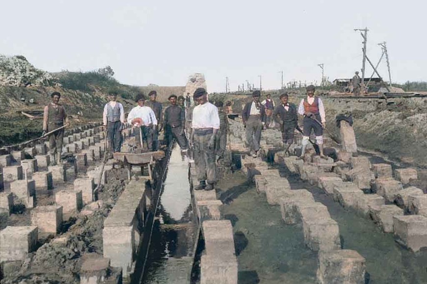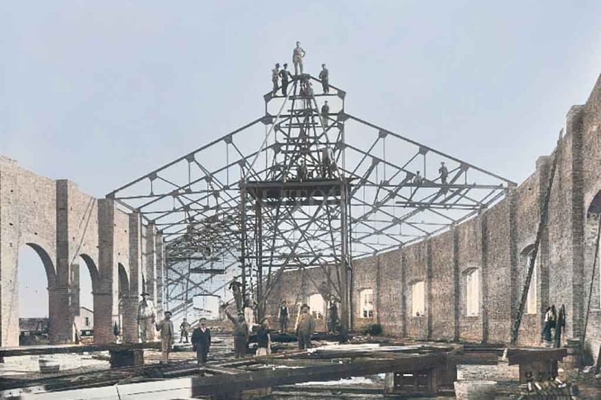 Santa Fe, c. 1905. José Femminini. Obreros trabajando en la construcción del galpón central de locomotoras del Ferrocarril de Santa Fe. Desde fines de 2010 funciona allí el espacio cultural público «La Redonda. Arte y vida cotidiana». Museo Regional Ferroviario de Santa Fe Foto: Archivo El Litoral