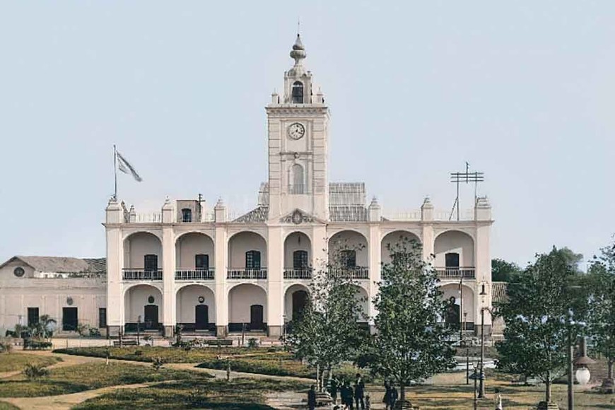 Santa Fe, c. 1890. José de Iriondo. El edificio del Cabildo, terminado aproximadamente en 1830 durante la gobernación del brigadier general Estanislao López y demolido en 1908, durante el mandato de Pedro Antonio Echagüe, para dar paso a la construcción de la actual Casa de Gobierno (Casa Gris). Se puede apreciar su torre sobreedificada en 1877, con el reloj que se incorporó en 1886 y que hoy está colocado en la torre derecha de la Basílica de Nuestra Señora del Carmen. Museo de la Ciudad Autónoma de Buenos AiresFoto: Archivo El Litoral