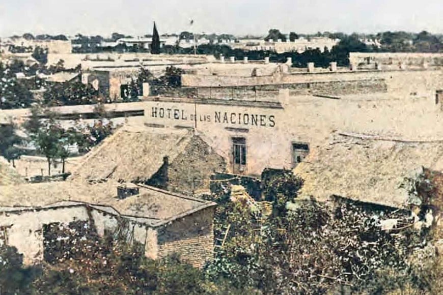 Santa Fe, 1873. Pedro Tappa. «Hotel de las Naciones». Ubicado en las calles 25 de Mayo y Falucho, luego denominado Hotel del Globo. En el mismo terreno se edificó posteriormente el Hotel Castelar. Enfrente, las ranchadas levantadas sobre la actual plazoleta. Museo Histórico Provincial «Brigadier General Estanislao López»Foto: Archivo El Litoral