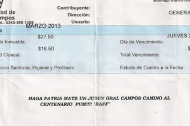 Martínez reveló que en una de las boletas municipales distribuidas en una casa de calle Mitre apareció la leyenda: “Haga Patria, Mate un Judío“.