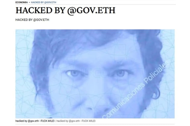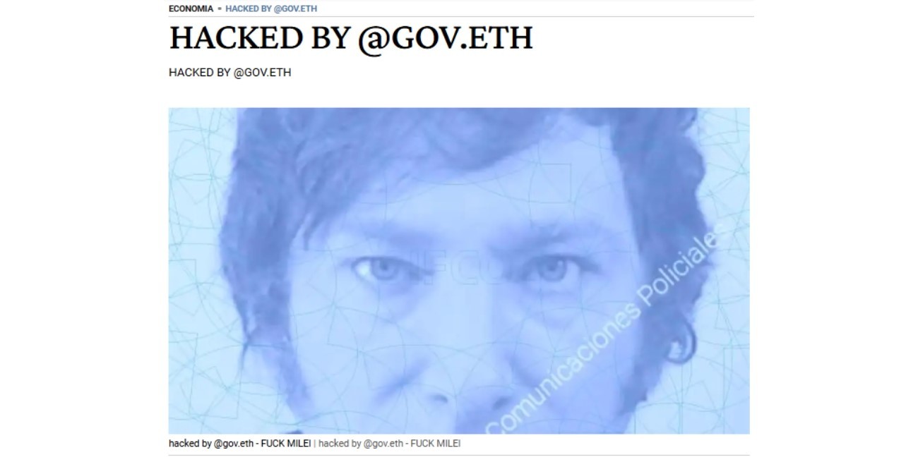 “HACKED BY @GOV.ETH” y “FUCK MILEI” se puede leer en repetidos apartados de un diario de la ciudad de Buenos Aires abocado a temáticas políticas.