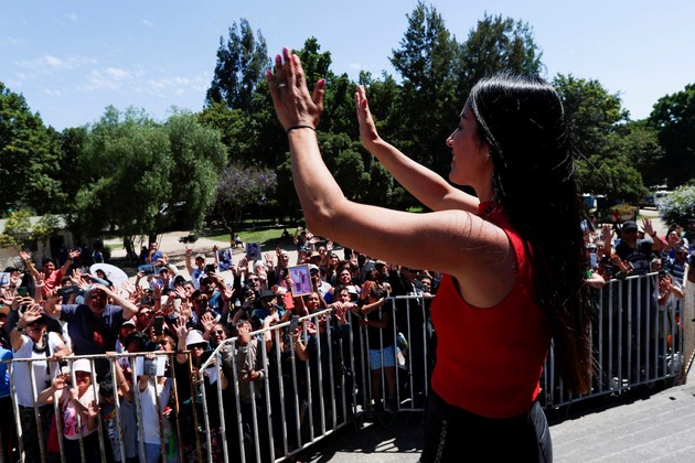 Leda Bergonzi 'La Sanadora de Rosario', a spiritual healer, waves to the crowd while arriving to conduct a ceremony for believers at Templo Votivo, Maipu area, Santiago, Chile, January 6, 2024. REUTERS/Francisco Paredes Sierra NO RESALES. NO ARCHIVES