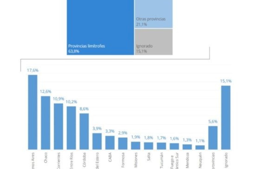 Y casi todos ellos (un 63.8%) vinieron de las provincias limítrofes: desde Buenos Aires (17,6%), Chaco (12,6%), Corrientes (10,9%) y Entre Ríos (10,2%).