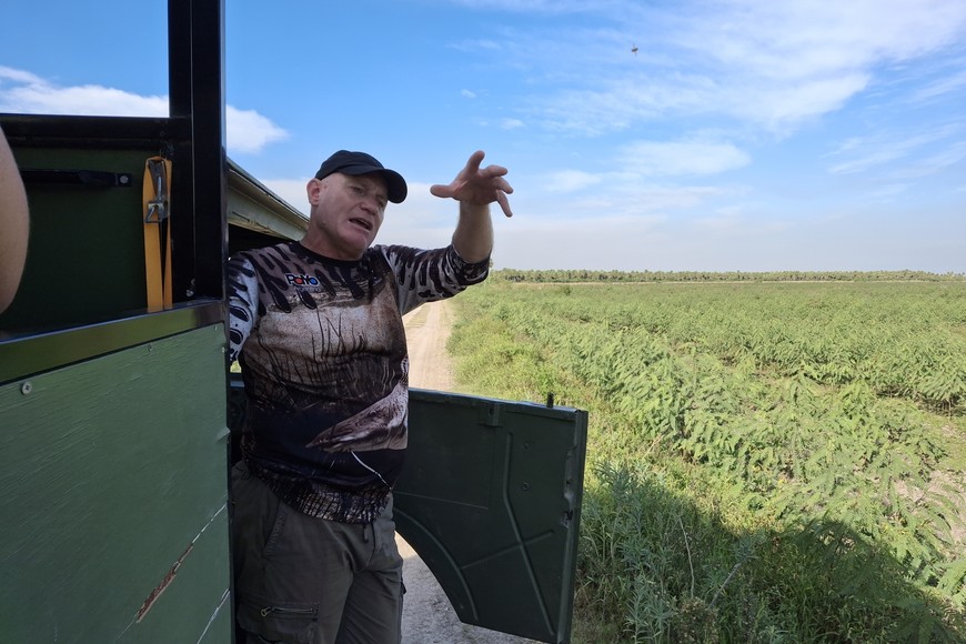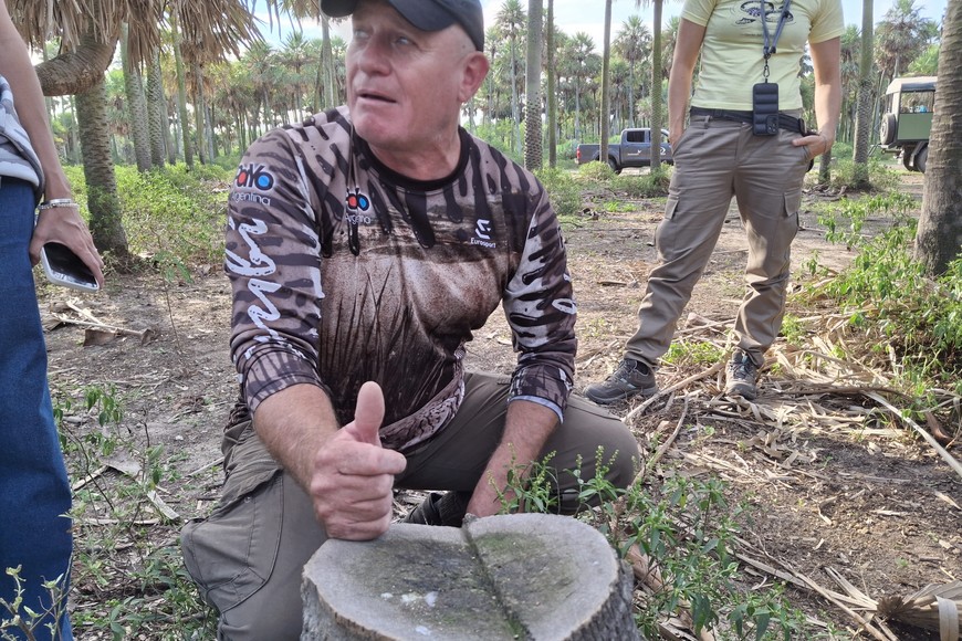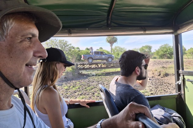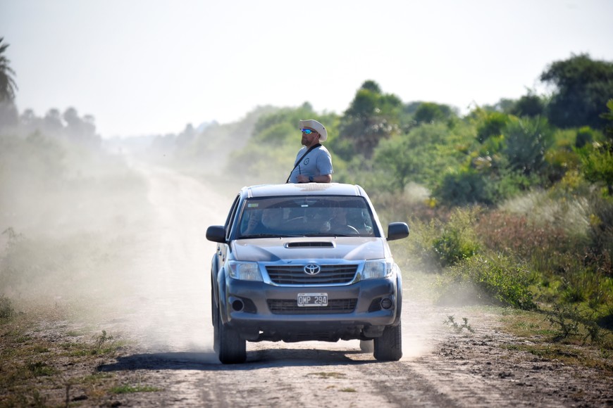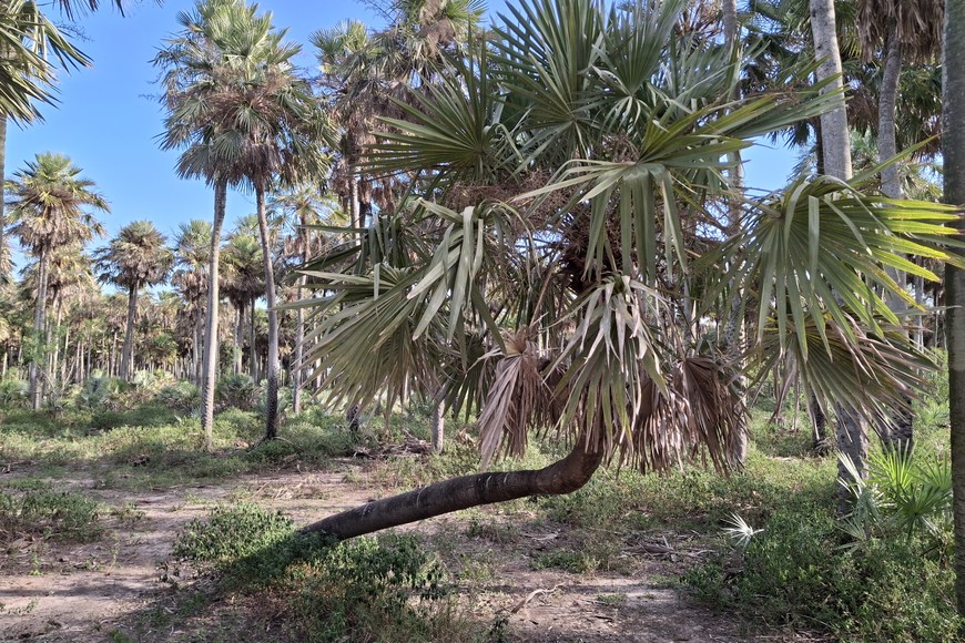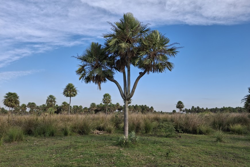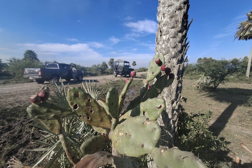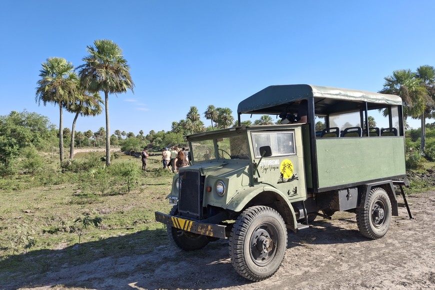 Es notable el cambio del ambiente a un lado y al otro de la huella de tierra por donde avanza el vehículo. A un lado se extiende el gran palmar; al otro, nace el monte junto al curso de agua lleno de pájaros y yacarés.