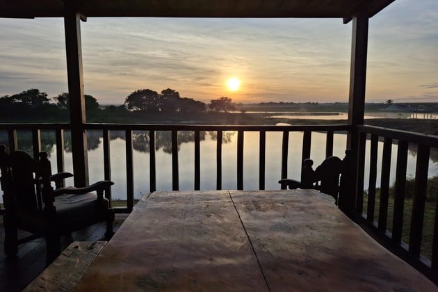 El amanecer en el Portal del Humedal de Jaaukanigás es indescriptible. Hay que ir a vivirlo. En un intento estéril de aproximación a contarlo se puede decir que la cabaña en palafito que cobijó a la delegación asoma al este junto a un brazo del río con un balcón de madera en el que el humito del primer mate se confunde con el del humedal en el horizonte, contra un rojizo sol que asoma y entibia la piel. El ambiente está lleno de pájaros. Sus cantos en la quietud.