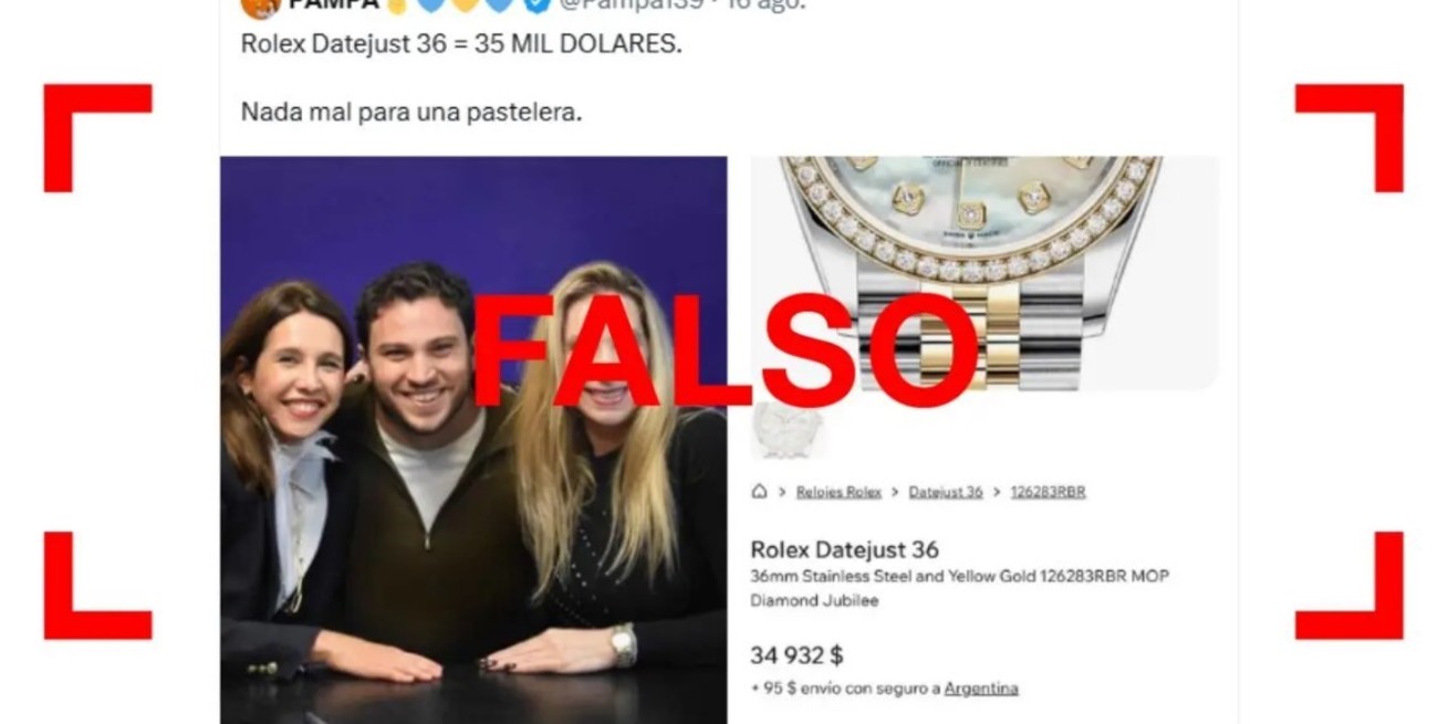 Sin embargo, esto es falso: en la foto de la publicación viral y en imágenes de los últimos meses se puede ver que el reloj es de la marca Grovana. Además, hay diferencias entre ambos: el Rolex tiene incrustaciones alrededor y en los puntos que marcan las horas, y el de Karina Milei, no. Además, el valor del reloj Grovana es mucho menor que el del Rolex que se menciona en el posteo.