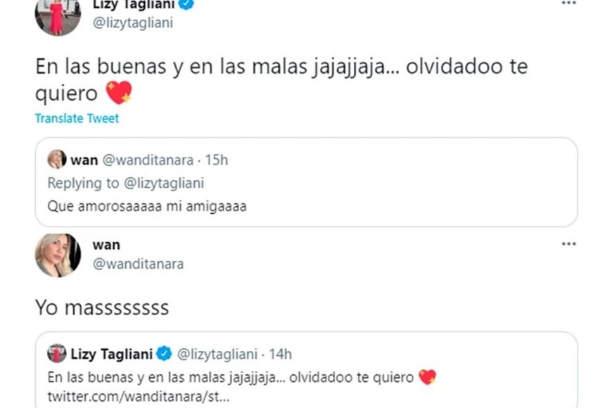 El intercambio luego siguió en Twitter, donde la empresaria lanzó una ironía: “Qué amorosaaaaa mi amigaaaa”. Y su compañera le respondió: “En las buenas y en las malas jajaja, olvidado, te quiero”. Para dejar en claro que todo fue en tono de humor, Wanda cerró: “Yo más”.