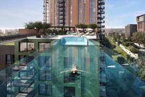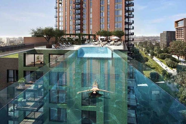 La piscina transparente se encuentra en el décimo piso y está suspendida entre dos bloques de pisos de lujo en Nine Elms, al suroeste de Londres.