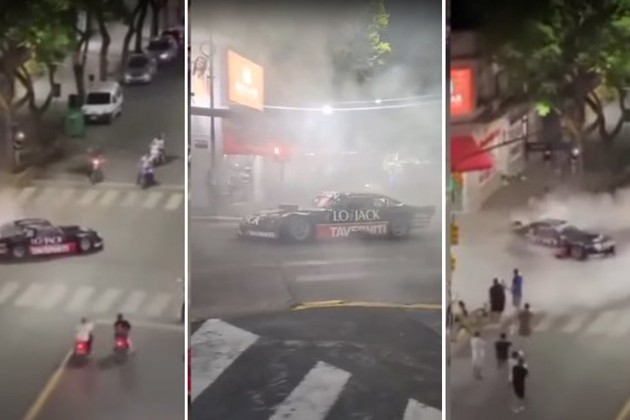 En las imágenes se observa cómo mientras conducía su “Chevy” de Turismo Carretera circulaban a escasa distancia autos, motos y cómo se agolpaban algunos transeúntes a presenciar el repentino espectáculo.