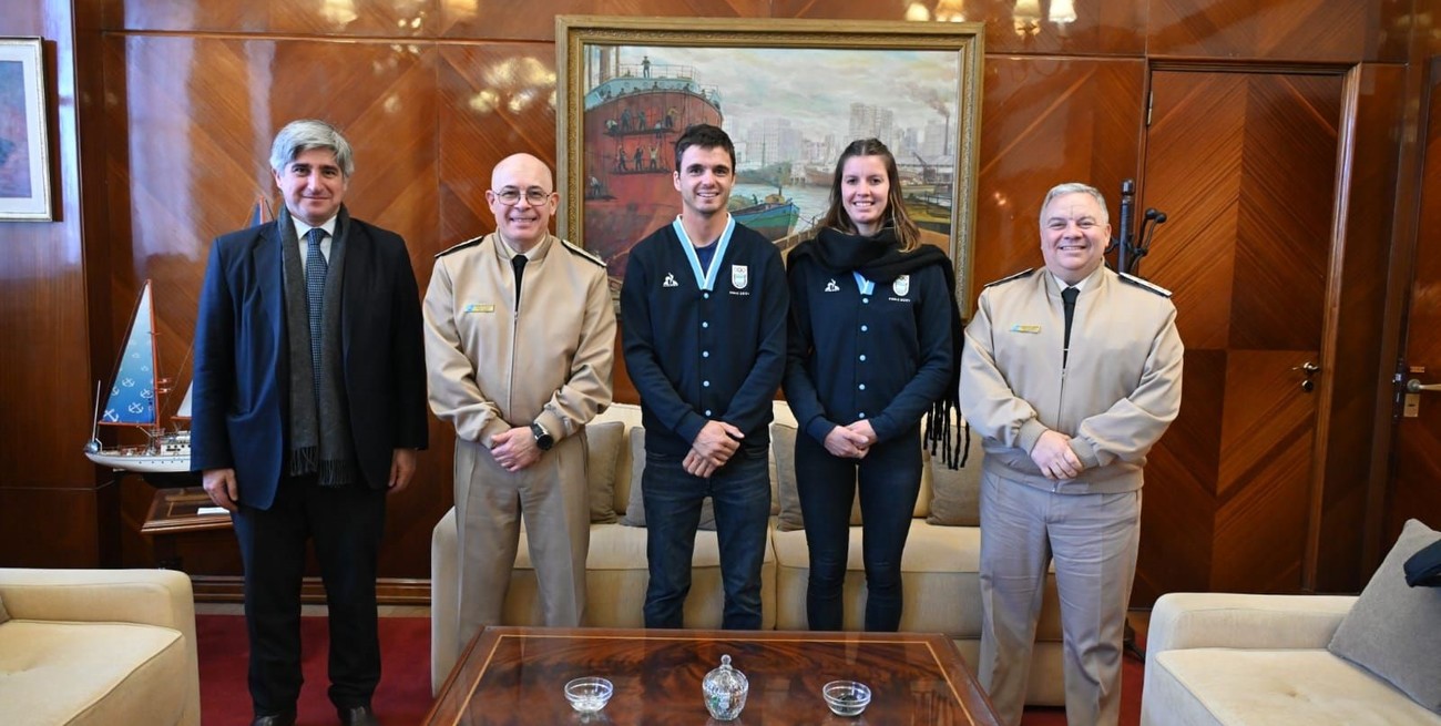 Mateo Majdalani y Eugenia Bosco, junto a su entrenador, Javier Conte, fueron condecorados por la plana mayor de la autoridad náutica argentina. “Nos llena de orgullo verlos aquí”, destacó el prefecto Guillermo Giménez Pérez.