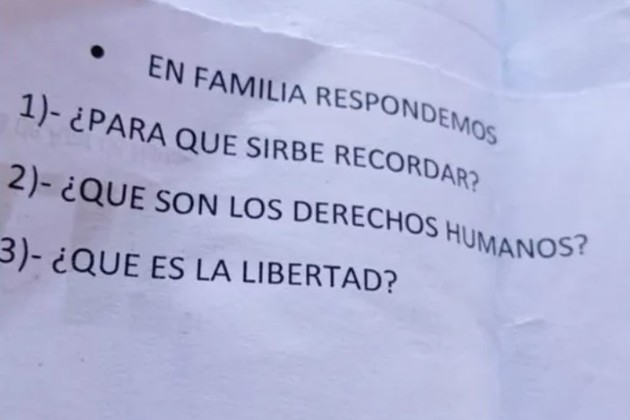 En la foto que publicaron, se puede ver una hoja impresa con la premisa "en familia respondemos", que apuntaba a generar un espacio de intercambio entre padres e hijos en torno a un nuevo aniversario del golpe de Estado de 1976. A la consigna le seguían una lista de tres preguntas para responder después del diálogo entre padres e hijos.