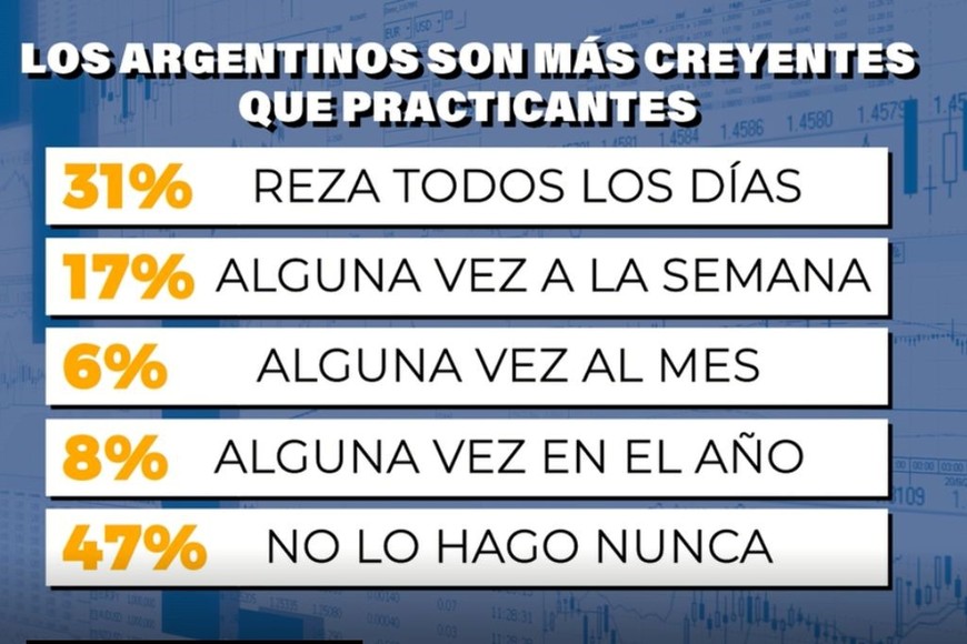 El informe muestra que el 31% de los argentinos reza todos los días, pero un 47% dice no hacerlo nunca. Solo un 17% lo hace semanalmente y el resto, con menos frecuencia. Esto indica una espiritualidad más íntima y menos ritualizada, donde muchas personas creen sin necesariamente practicar activamente.