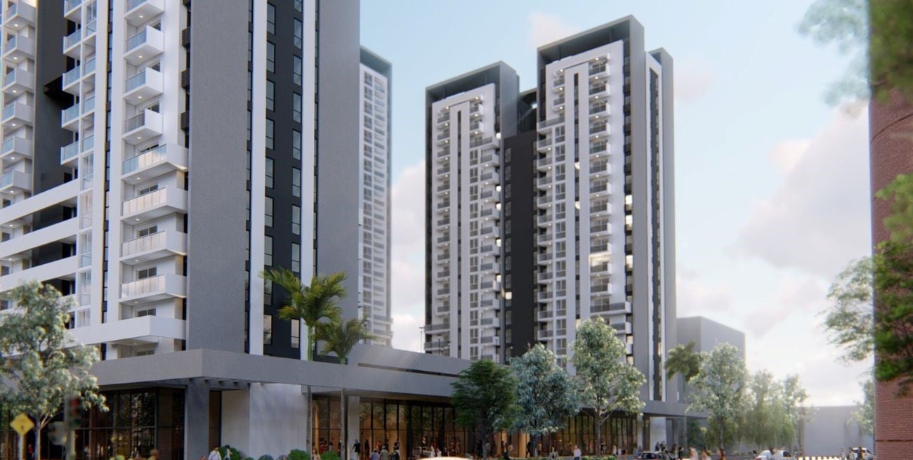 Las altas torres de 18, 24 y 30 pisos, cuentan con 3 niveles de cocheras y una galería comercial en planta baja que convierte el acceso al complejo en un pintoresco paseo recreativo.