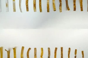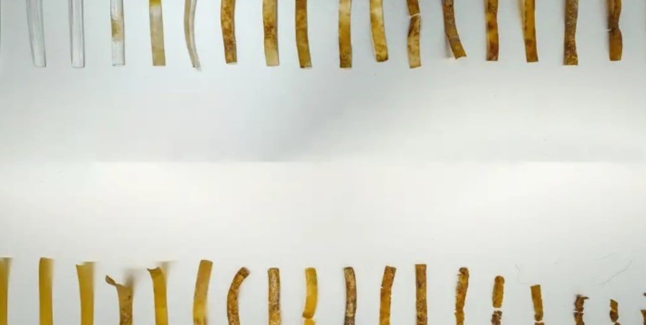 Tiras de poliuretano termoplástico simple (arriba) y poliuretano termoplástico "vivo" (abajo) en diferentes etapas de descomposición durante cinco meses de estar en abono.
