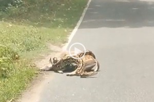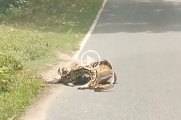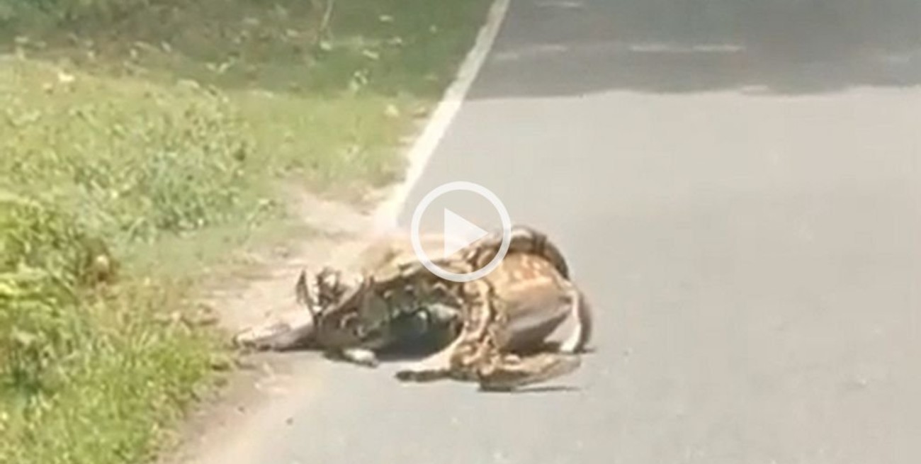 El tuitero Vineet Vashist comparte un vídeo en el que enorme serpiente pitón trata de estrangular a un ciervo para devorarlo en mitad de una carretera en el Parque nacional de Jim Corbett de la India.