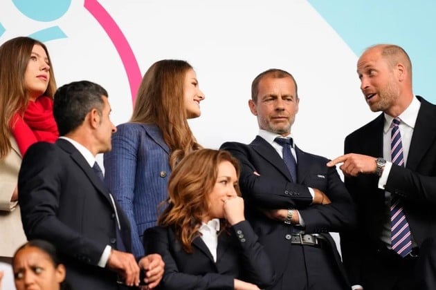 Los cuatro se saludaron de forma muy cariñosa y se fotografiaron juntos antes de subir al palco del St. Jakob-Park. Una vez allí, Guillermo charló muy animado con Leonor únicamente separados por el presidente de la UEFA, Aleksander Ceferin.