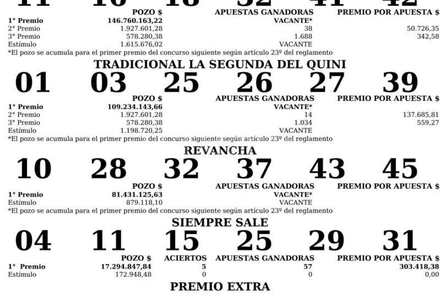 Cabe recordar que el valor de la apuesta Tradicional 1º sorteo y la Segunda es de $ 80,00. Con Revancha: $ 120,00. Con Revancha y Siempre Sale: $ 160,00.