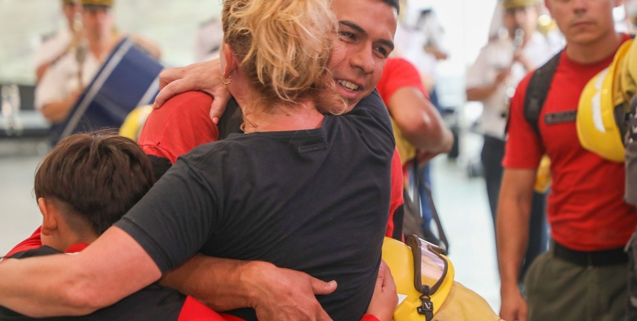 Los brigadistas fueron recibidos por ministro de Justicia y Seguridad, Pablo Cococcioni; el secretario de Protección Civil y Gestión de Riesgos Marcos Escajadillo, y la secretaria de Gestión Institucional, Virginia Coudannes; entre otros funcionarios provinciales.
