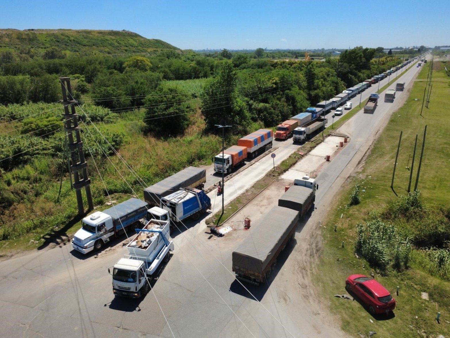 6 / 8 Largas filas de camiones esperando para descargar en el puerto de Rosario este jueves por la mañana. Foto: Marcelo Manera