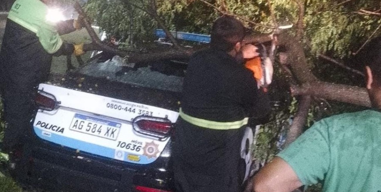 Uno de los hechos más significativos se registró en Uriburu y Francia, donde un árbol de gran porte cayó sobre un vehículo policial.