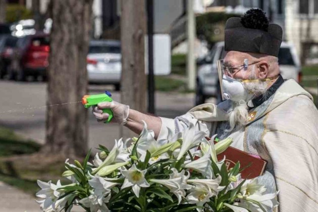 Durante las celebraciones de Semana Santa, el padre Tim Pelc utilizó una pequeña pistola de agua para bendecir a sus feligreses. El religioso estadounidense rellenó el arma de juguete con agua bendita, y desde una distancia segura, disparó a los devotos, que esperaron su turno dentro de sus autos.