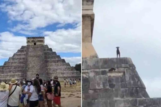En México, durante una visita familiar a la pirámide de Chichén Itzá, un perro decidió al escaparse de sus dueños que lo mejor sería subir las empinadas escaleras.
