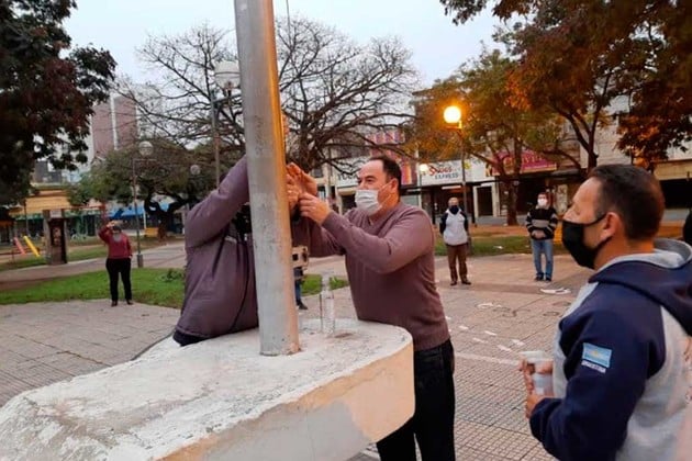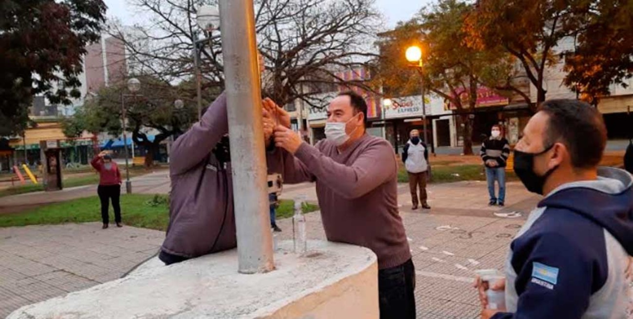 en un reducido número, con el distanciamiento social pertinente y la zanitizaciòn correspondiente, y sin público presente, procedieron al izamiento del pabellòn nacional en la Plaza del Soldado Argentino.