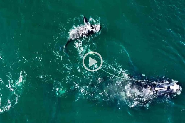 Enternecedoras y fuertes imágenes corren por redes sociales de una ballena franca que da a luz a su cría mientras estaba apresada en una red de pesca.